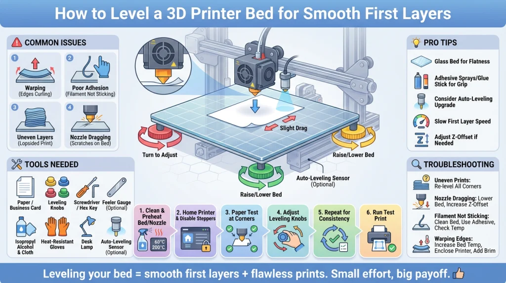 Leveling your 3D printer bed doesn’t require fancy gadgets. With a few simple tools, you can achieve a perfectly even surface for smooth first layers. Here’s what you’ll need: