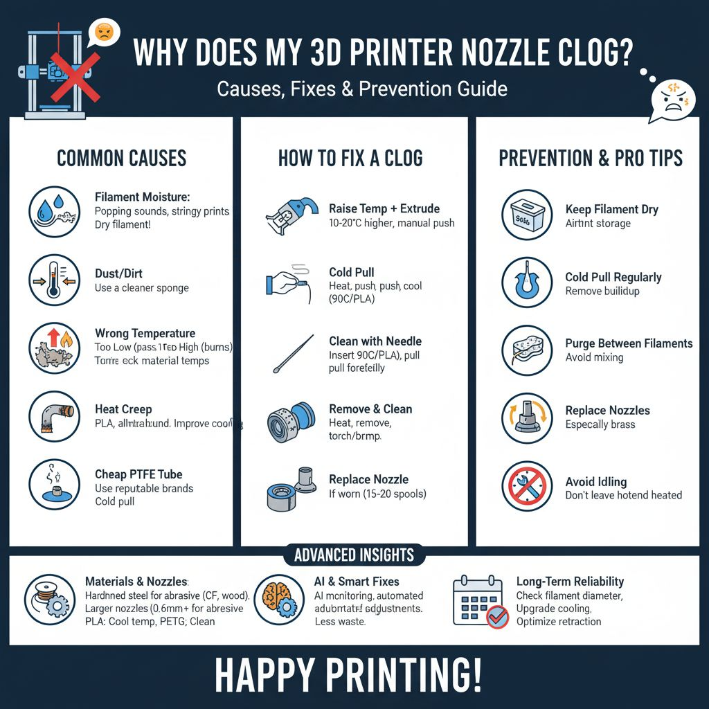 Nozzle clogs happen due to filament moisture, dust or debris, incorrect temperatures, heat creep, or residue buildup. Cheap or abrasive filaments and worn PTFE tubes can also cause clogs. Identifying the root cause is key to prevention.