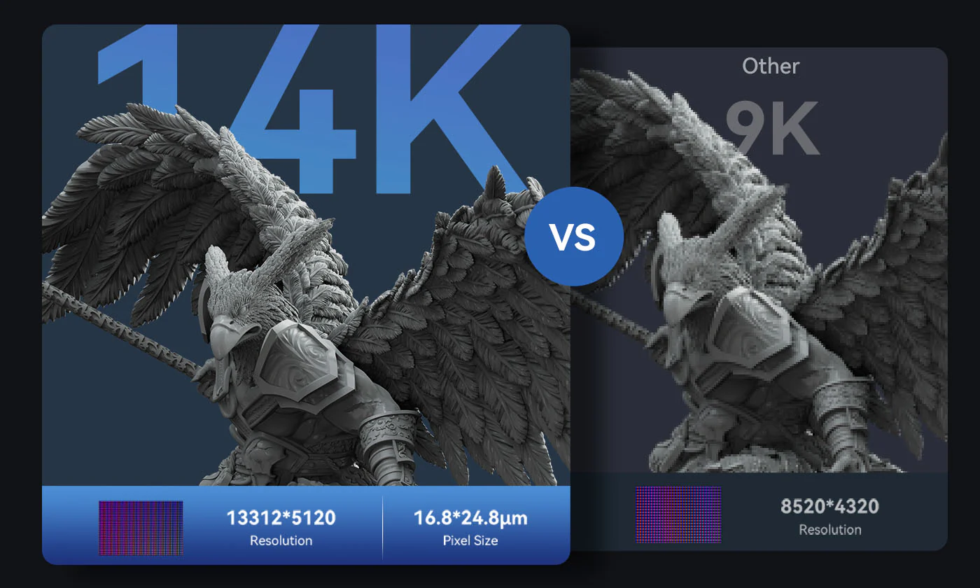 • 14K high-resolution screen: With an XY resolution of 16.8 x 24.8 μm and a screen resolution of 13312 x 5120 pixels, the printer can produce prints with exceptional detail and smooth surfaces.