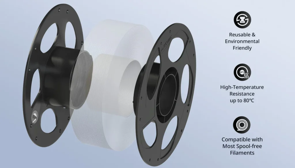 The reusable filament spool features a threaded connection system designed for enhanced stability when used with spool-free filaments. This design significantly reduces the risk of entanglement, filament scattering, and operational errors.