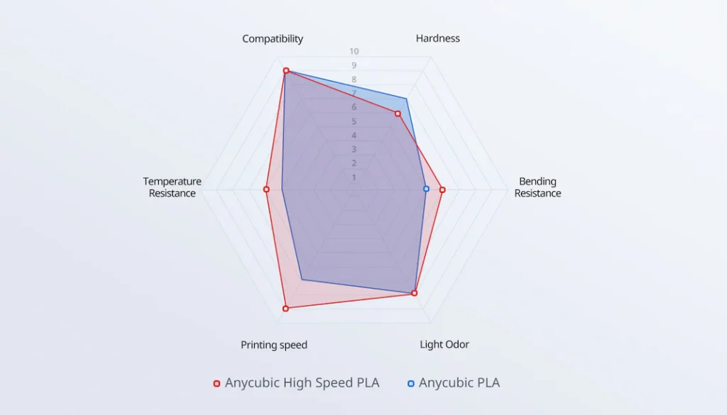 • Fluidity and cooling: The core technology of all high-speed PLAs revolves around a modified formulation that melts faster (higher fluidity) and solidifies more quickly (better heat dissipation). This is true for Anycubic and its competitors.