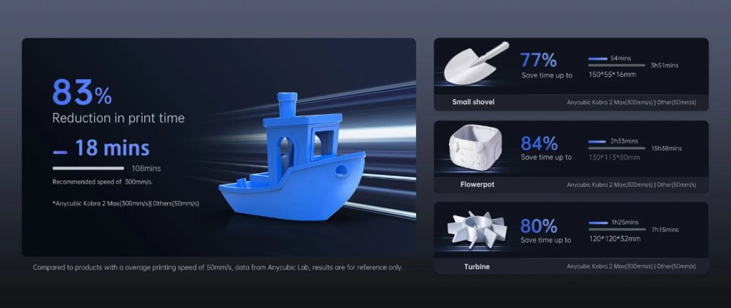 - Maximum speed: Advertised as up to 500 mm/s, with a standard speed of 300 mm/s. However, independent tests found that reliable printing speeds are closer to 150–230 mm/s.
