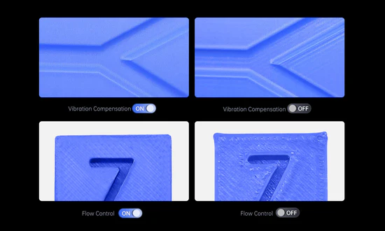 With one-click ‘Vibration Compensation’, resonance frequency detection on the X/Y axis eliminates vertical and bracket lines for print stability. ‘Flow Control’ enhances layer quality via smart compensation for retraction and refilling, ensuring uniform, detailed results.