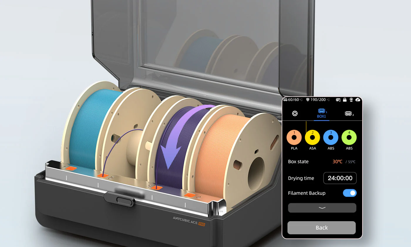 • Filament management: The ACE Pro handles automatic loading and unloading and includes intelligent identification for specific RFID-chipped Anycubic filaments. It also features filament run-out detection and backup functionality to switch to another spool when one runs out.