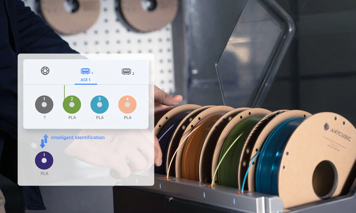 • Filament management: The system features intelligent identification, recognizing official Anycubic RFID-chipped filaments to apply the correct settings automatically. It also includes automatic loading/unloading, filament backup, and clog detection.