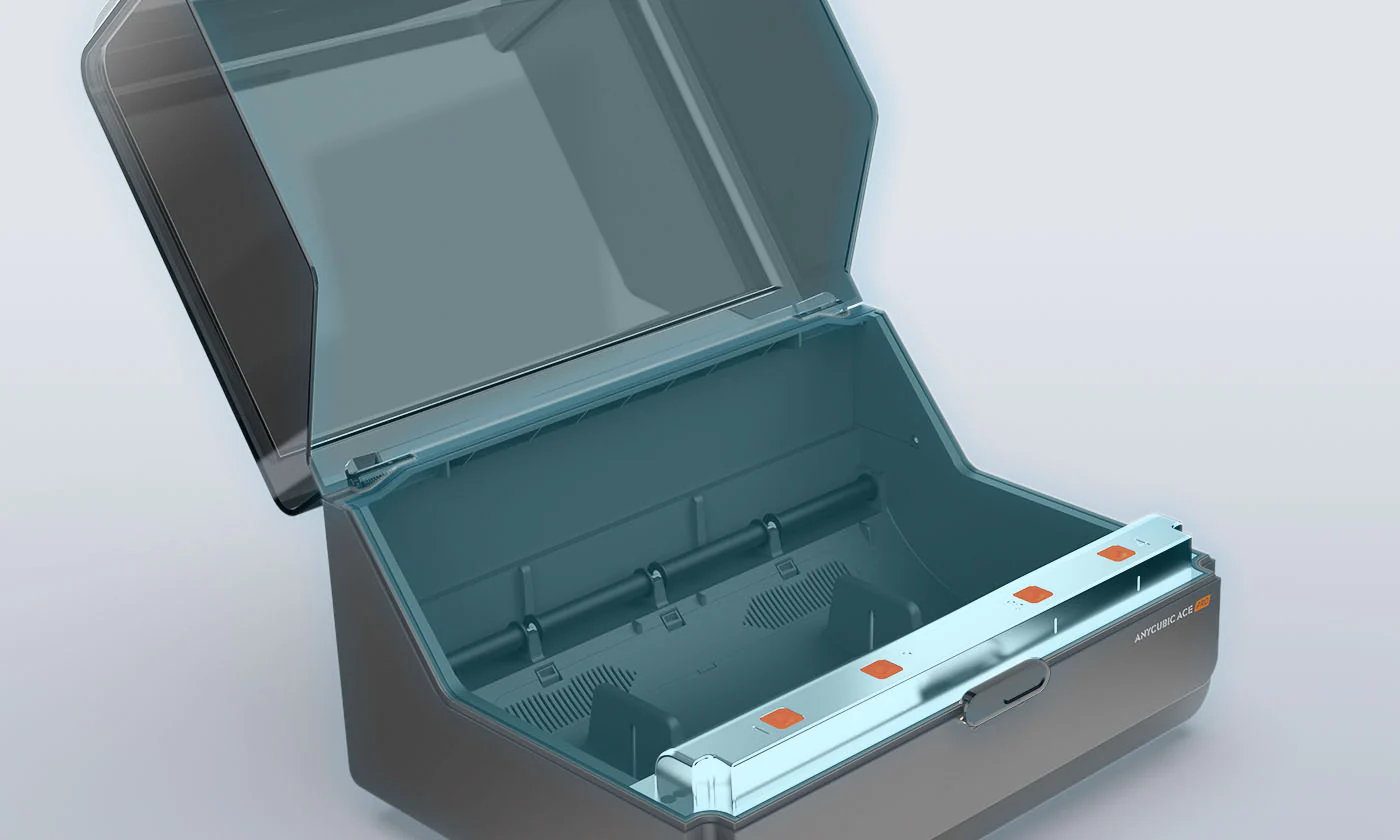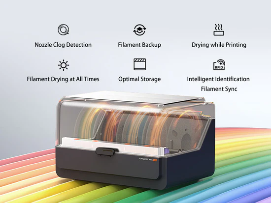 • Multi-color system: The ACE Pro unit is a sealed, heated chamber that can house and feed up to four filament spools. For up to eight-color printing, a second ACE Pro unit can be chained with a separate 8-filament hub.