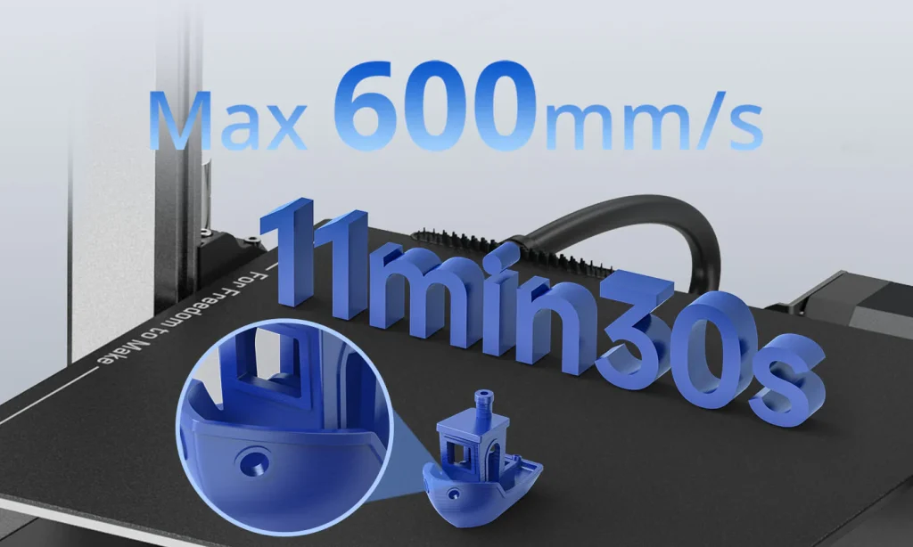 • Up to 600mm/s speed: The Kobra 3 can reach a maximum printing speed of 600mm/s, with a recommended speed of 300mm/s. It has a maximum acceleration of 20,000 mm/s².