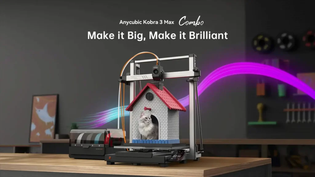 The Anycubic Kobra 3 Max Combo is a high-speed, multicolor FDM 3D printer designed for large-format consumer printing. It combines a massive build volume with advanced multicolor capabilities, making it suitable for hobbyists, designers, and small-scale manufacturers.