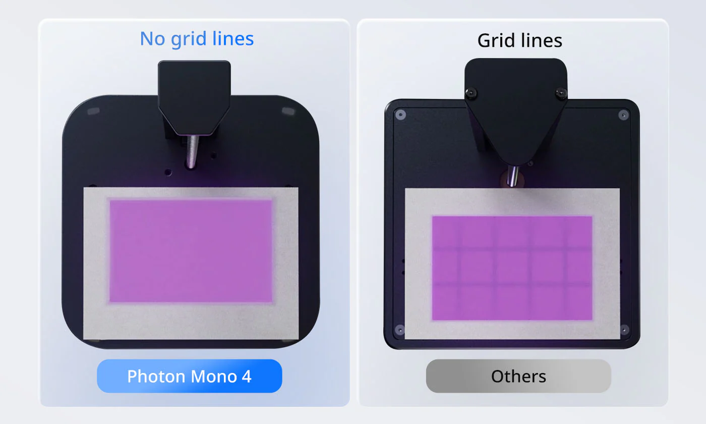 • Laser-engraved Print Platform 2.0】With a new design, the laser engraving platform of the photon mono 4 improves adhesion to mitigate lifting and warping of the model during 3d printing, while keeping the removal process simple and smooth.