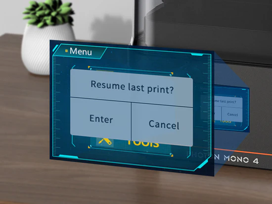• Power Loss Recovery: A power-resume function allows the printer to continue a job from where it left off after a power outage, saving material and preventing print failures.