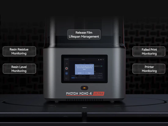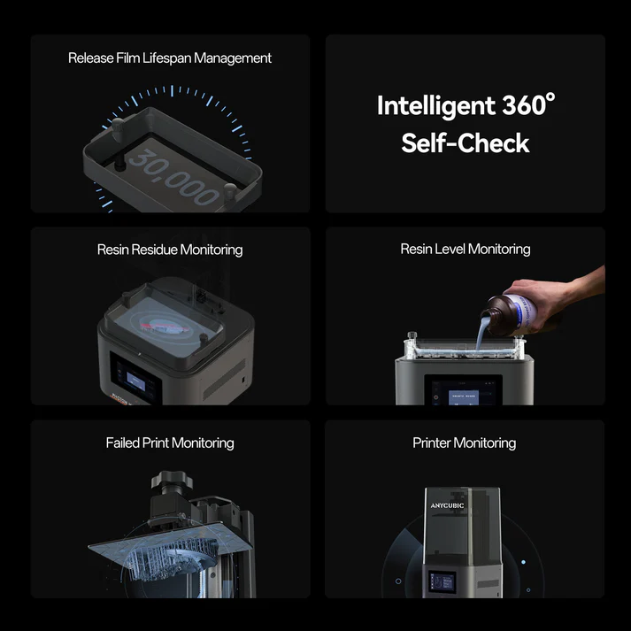 - 360° self-check: The printer performs a full series of intelligent checks, including self-inspection, resin residue detection, failed print detection, and monitoring the lifespan of the ACF film.
