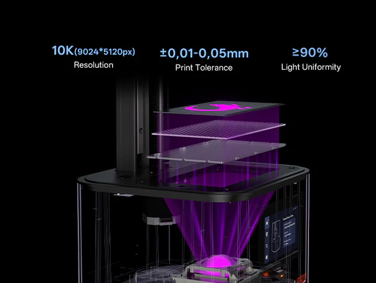 - 【Advanced COB Light Source】The COB light source system combined with Fresnel lenses can reach the light angle within 3° ,ensuring no stray light interference on the 7” 10K monochrome. By the Light Uniformity Algorithm, the light uniformity rate reaches ≥90%, reducing dimensional errors in each printed layer and ensuring consistent printing