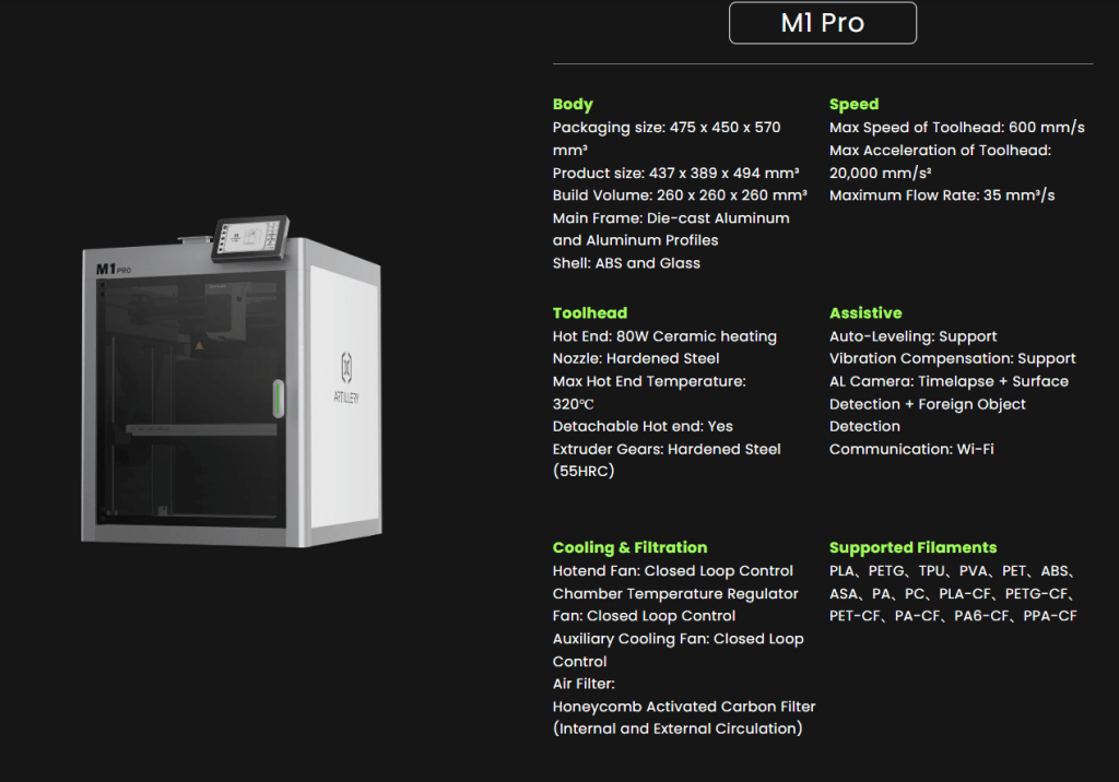 Artillery M1 Pro is a Core XY 3D printer that pairs powerful performance, 260 × 260 × 260 mm build area, and up to 600 mm/s speed—with a built-in AI…