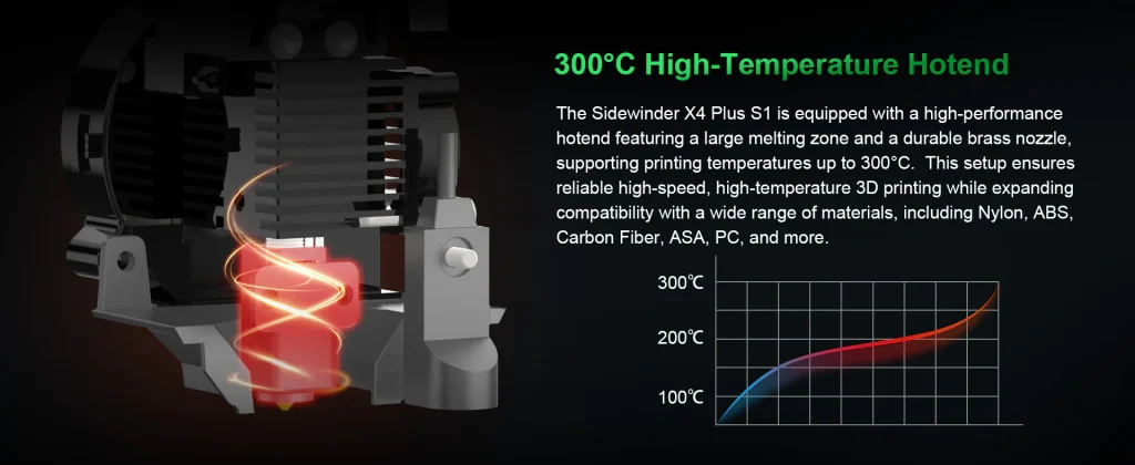Temperature Capability: Complementing its hardware prowess is a 300°C high-temperature hotend. This feature broadens the scope of printable materials, allowing users to work with advanced engineering filaments such as Nylon, Polycarbonate, and Carbon Fiber composites, thus making the Sidewinder X4 Plus a versatile tool for various applications.