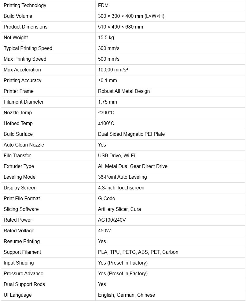 The printer comes with Klipper firmware pre-installed and can achieve print speeds of up to 500mm/s (default 300mm/s) with acceleration up to 10,000mm/s². The ARM 64-bit 1.5 GHz quad-core processor ensures smooth performance at these high speeds without sacrificing quality.