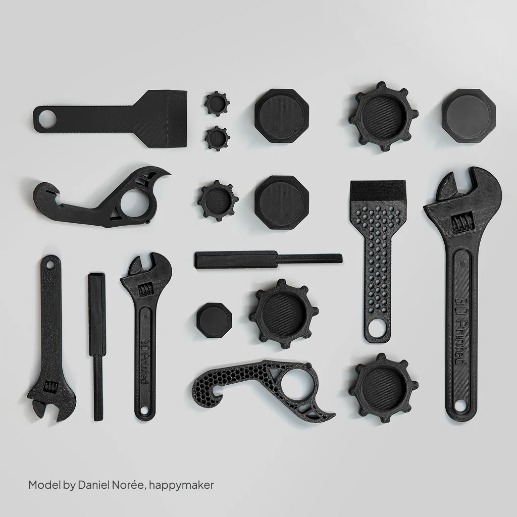 Comes with a brass-hardened steel nozzle (0.4 mm by default), with a hardened steel dual-gear extruder.