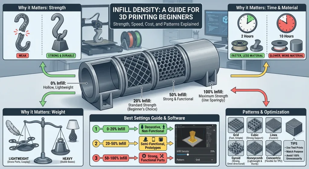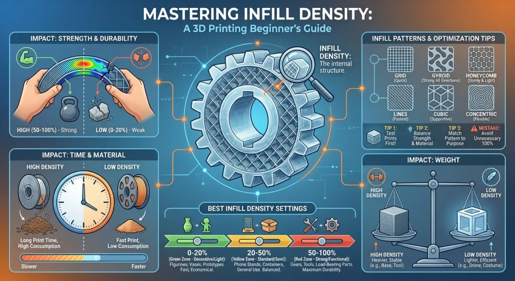 Choosing the right infill density is essential for balancing strength, weight, and material usage in 3D printing. Here’s a simple guide to help beginners: