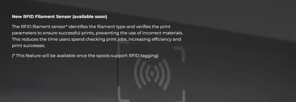 - New RFID Filament Sensor: Identifies material and loads correct print profiles.
