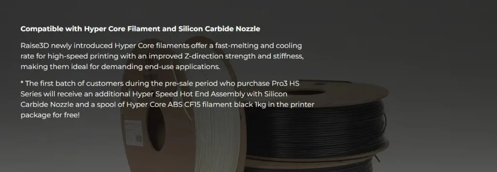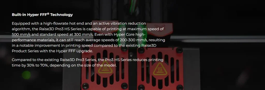 The Raise3D Pro3 HS Series incorporates Hyper FFF® technology for precise and reliable high-speed printing, with Hyper Speed technology providing a high-flow-rate hot end and active vibration reduction algorithm.