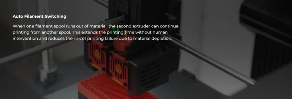 - Auto Filament Switching: The dual extruder automatically switches spools when one runs out.