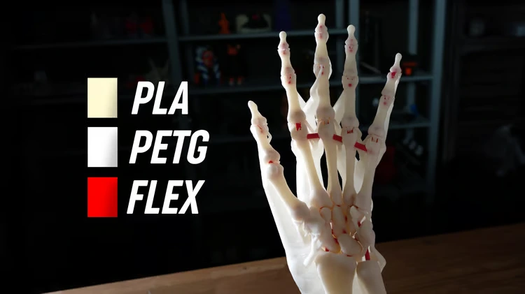 This model of a human hand created using CT scan data beautifully combines firm PLA with flexible filaments to achieve incredible detail and functionality. This allows surgeons to better identify which parts of the bone limit movement and demonstrate this to their patients. Special locks inside the model were designed to improve the adherence between PLA and Flex parts.