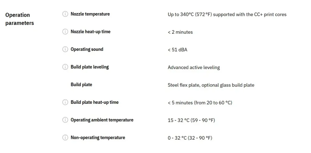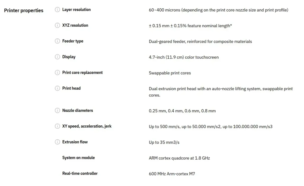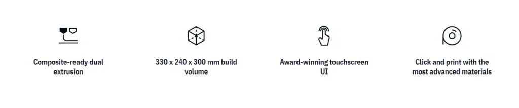 - Composite materials (e.g., Carbon-fiber and glass-fiber reinforced composites) due to its composite-ready feeders and CC+ print cores. It supports over 300 different filament types.
