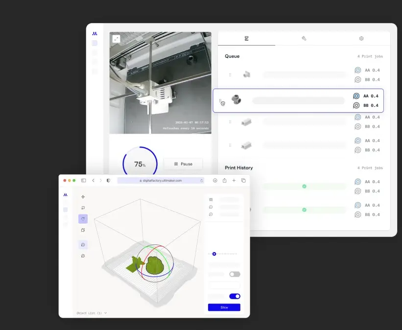 Digital Factory is designed to streamline every step of your 3D printing workflow, from slicing, to file management and even maintenance. Scalable for any team or enterprise, Digital Factory makes managing your 3D printing projects easier, faster, and more collaborative.
